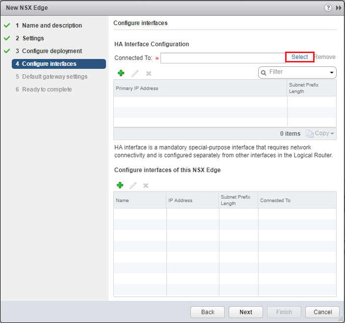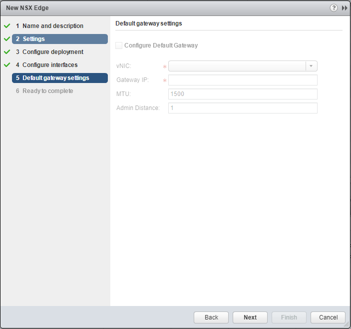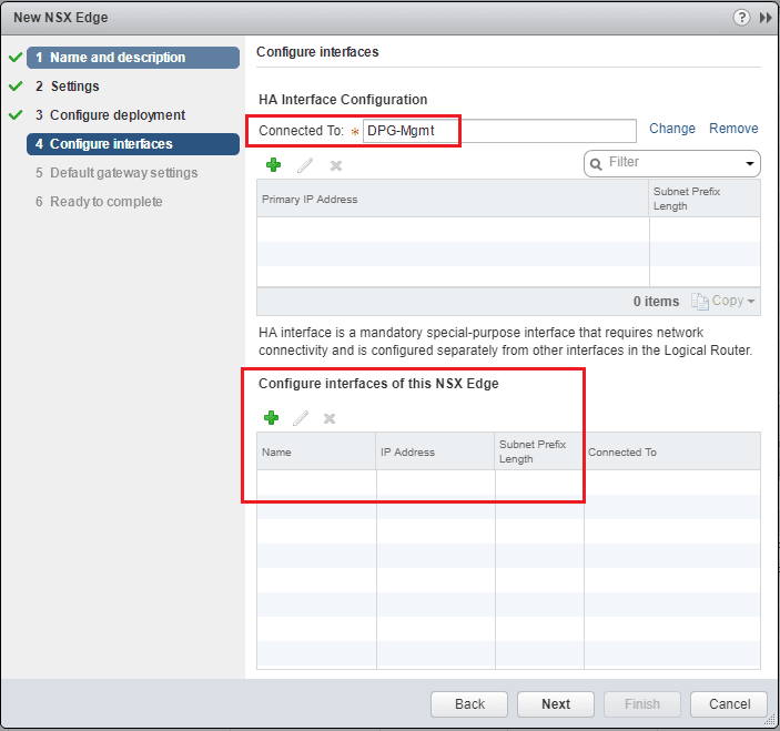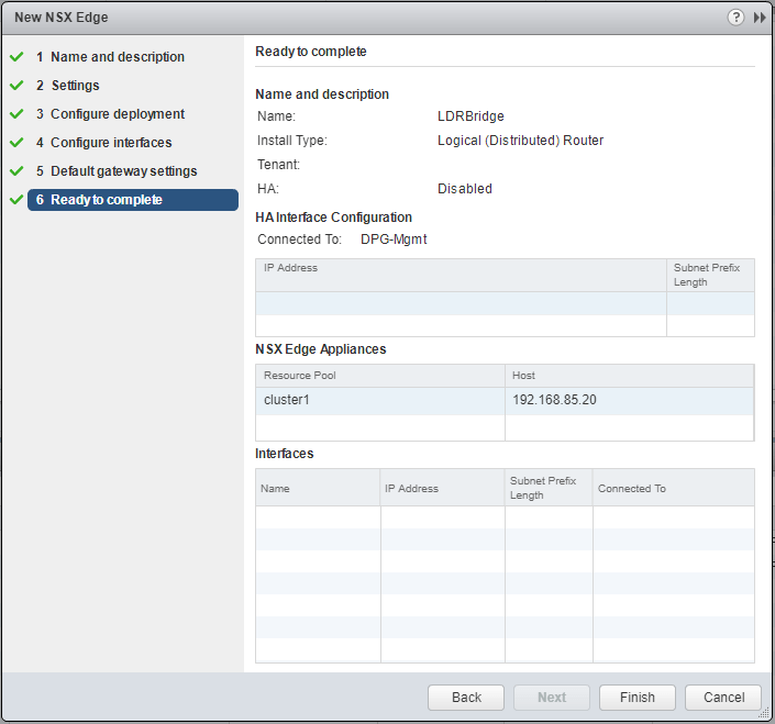 Note how for the layer 2 bridge we can simply leave theย interfaces of this NSX Edgeย unconfigured. ย We don’t need any interfaces since we are simply bridging our VXLAN with our VLAN.