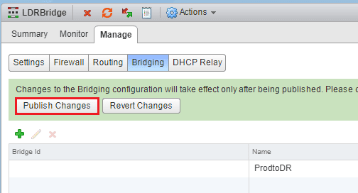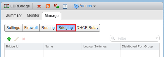 Now that we have our NSX Edge configured. ย We go back to theย Networking & Securityย >> NSX Edges and double click on our newly configured DLR. ย Click on theย Manage tab and then clickย Bridging. ย Click the green “+” sign to add a new Bridge.