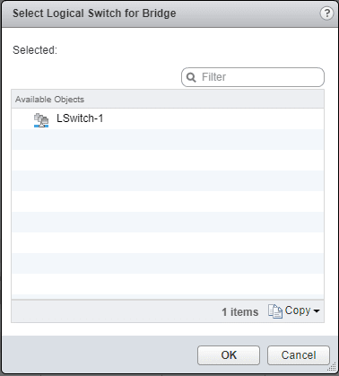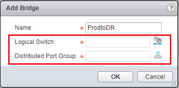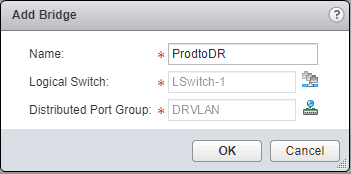 Theย Add Bridgeย dialog opens. ย Choose a name for the bridge and we also are required to choose aย Logical Switch and aย Distributed Port Group. ย The Logical Switch would be our VXLAN network and ourย Distributed Port Group represents our VLAN backed network.