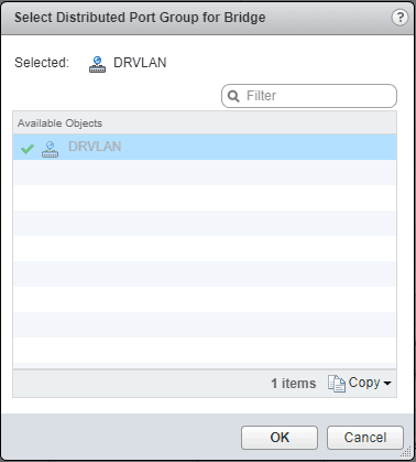 Next, we select the Distributed Port Group for the VLAN side. ย A note here, you have to have a Ditstributed port group that is VLAN backed with a VLAN configured. ย If you don’t, it will not be listed here.