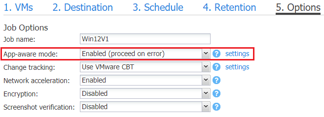 You may wonder, what about data in memory that havenโt been written to disk such as with database applications?ย This is where โapp-aware modeโ comes into play.ย With application aware backup and replication jobs, volume shadow copy writers force application data living in memory to be flushed to disk before the backup happens.ย This allows for applications such as databases applications to maintain transactional consistency.ย Any servers that run applications that need transactional consistency such as Microsoft SQL Server or Microsoft Exchange should use the app-aware backup mode to consistently backup these applications.