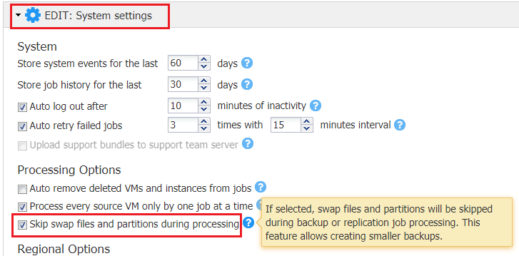 Under the System settings >> Processing Options you will see the checkbox to Skip swap files and partitions during processing.ย The bubble tip if you hover over the โ?โ for help explains โ โIf selected, swap files and partitions will be skipped during backup or replication job processing.ย This feature allows creating smaller backups.โ