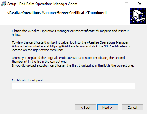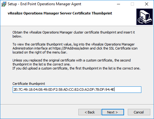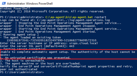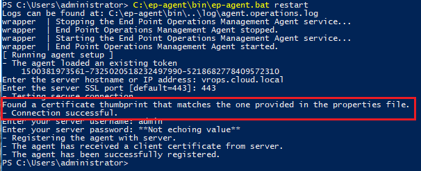 If you think you entered the wrong thumbprint, like I did, you can change this after the fact by finding the thumbprint section in this file – C:ep-agentconfagent.properties file. ย After restarting the agent after repopulating the thumbprint, I saw the agent successfully make communication with the vRealize Operations Manager 6.6 server.