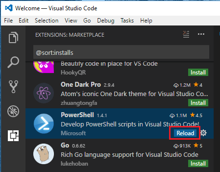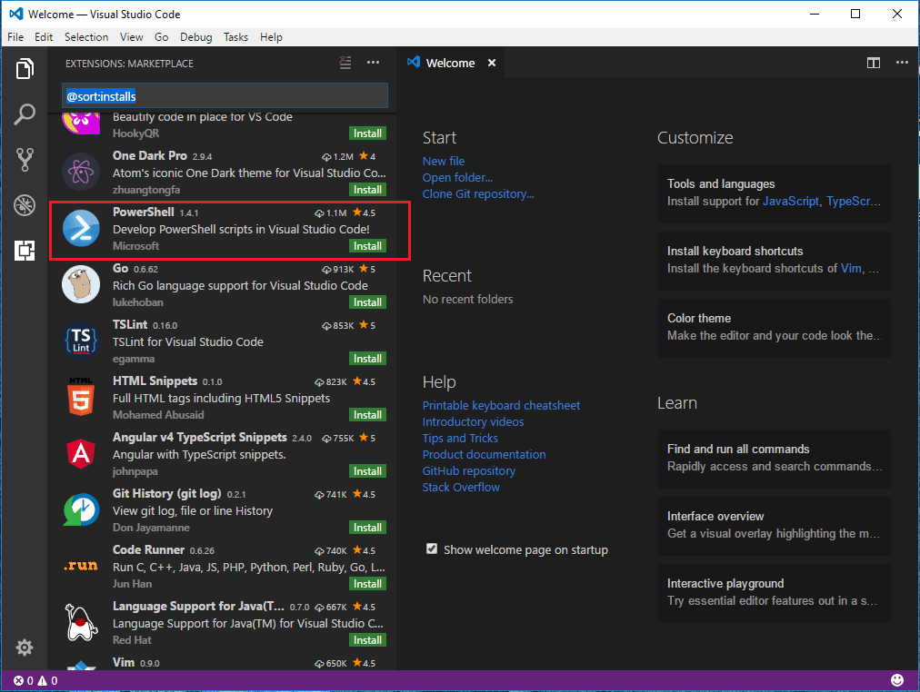 The first thing you will want to do is click on the last icon in the sidebar for theย Extensions Marketplace and type in “PowerShell” or similar to bring up the available installs. ย Click theย Install button.
