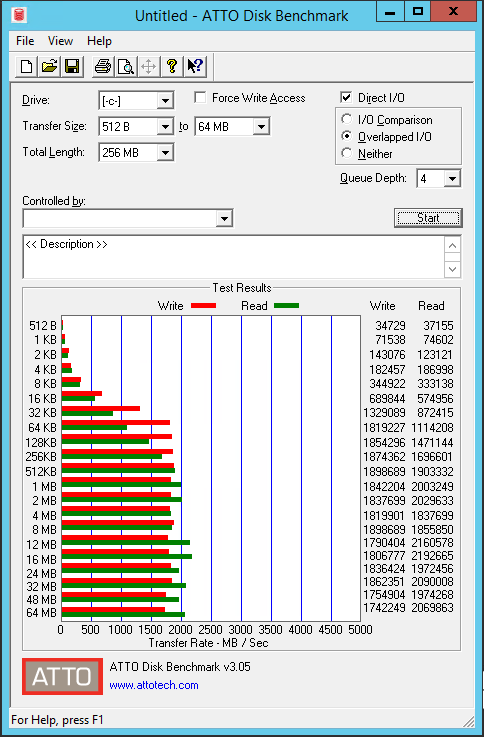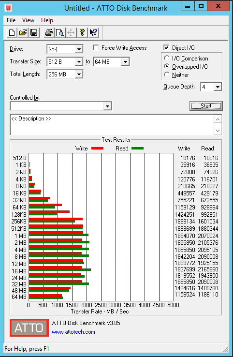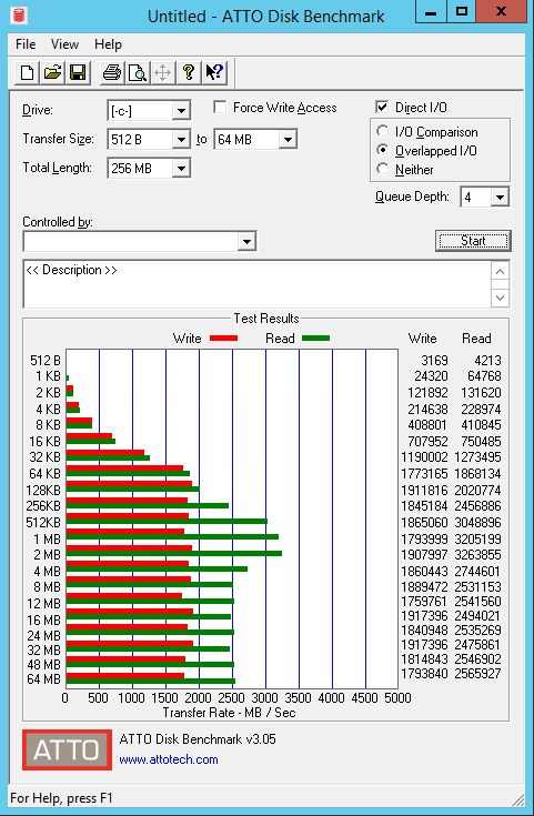 - Using transfer size 512 B to 64 MB, total length 256 MB, Direct I/O, queue depth 4