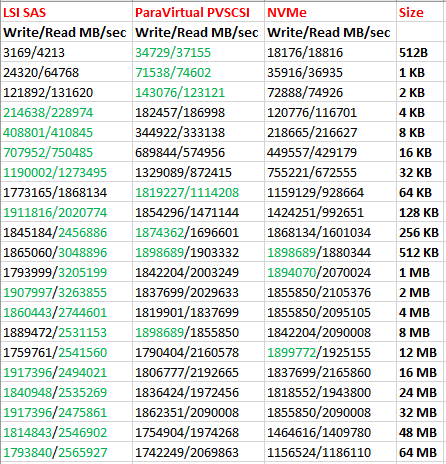 After running all three tests with the different controllers, I had some very interesting results when comparing between the three. ย I have highlighted the “winner” for each category in green. ย The PVSCSI seemed to shine with smaller file sizes. ย However, the surprise here for me was the NVMe controller was behind the LSI SAS and PVSCSI in most categories in my single test comparison using the same virtual machine.