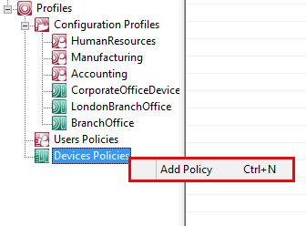 Once we have the device profile configured, we can setup a Device Policy.ย Right-click the Devices Policies and choose Add Policy.