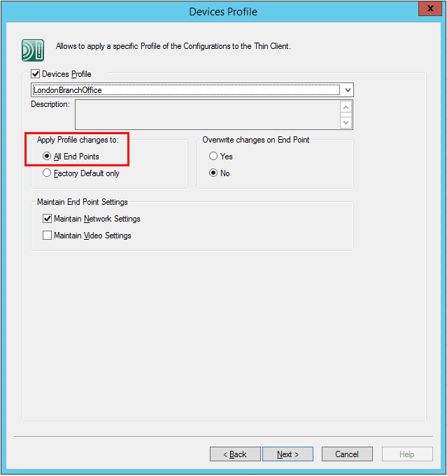 After clicking Next, we can set the Devices Profile that the Device Policy applies to.ย Drop down the combo box and select the device profile.ย Notice also, the โApply Profile changes toโ we have set to All End Points so it applies to all devices matching the profile.