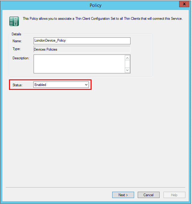 Choose a name for the Device Policy as well as any description you want to set.ย Also, we want to set the Status to Enabled.ย Click Next.
