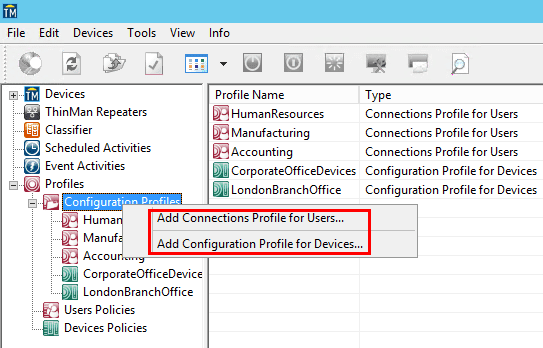 The โZero Configโ provisioning of client devices can be accomplished by creating a configuration profile for devices and a device policy.ย Letโs take a look at an example of creating the device profile and assigning a default device policy.ย The first thing we do is create a Configuration profile.ย We can begin by right-clicking the configuration profiles node in the ThinMan console.