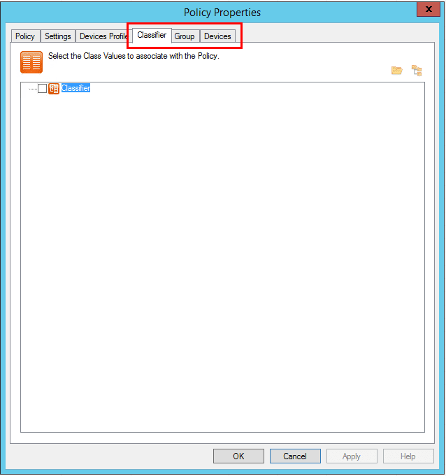 We donโt have to set any configuration on the Classifier, Group, or Devices tabs as below we are going to set the policy as โDefaultโ Policy.
