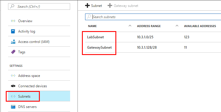 Notice ourย Subnets. ย As you can see, I have setup aย subnet and aย Gateway Subnet. ย You can only have one Gateway subnet, so you see it greyed out below.