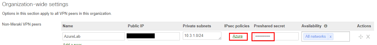 - You have to configure an External IP address for the Azure VPN to use as the WAN address to connect the Meraki site to site VPN.