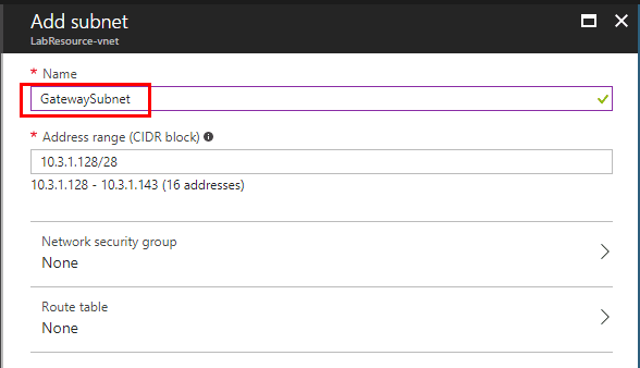 To step back though, let’s look at creating the Gateway subnet. ย As mentioned in the outset, the name has to beย GatewaySubnet for it to work correctly. ย Yourย Address range also must fall in theย address space you created earlier.