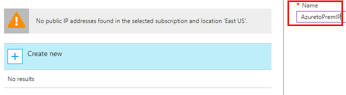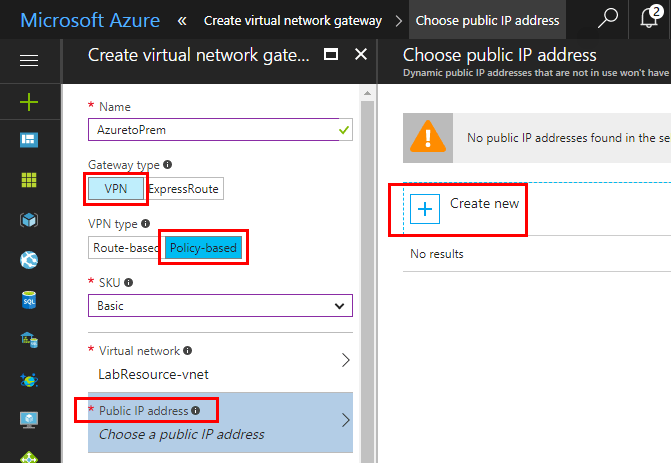 Since the Meraki can only use the IKE1 VPN type, we need to create aย Policy-based VPN. ย This will be compatible with the Meraki VPN. ย Also, we need to create a public ip address for the connecting partner. ย Choose theย Create new and we can provision the IP.
