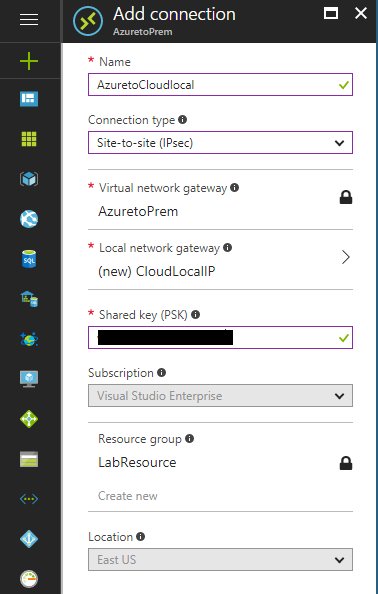 Here we setup the actual connection to our on premise Meraki device. ย Choose theย Site-to-site (IPsec)ย connection type. ย Also, we click tehย Local network gatewayย to configure the IP address we will connect to from Azure. Also important, enter the shared key passphrase which needs to be a strong password.