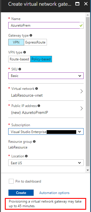 Once we have everything populated, note at the very bottom the timeframe it takes to provision a new virtual network gateway – up to 45 minutes. ย So this is definitely one you want to kick off and go grab some coffee, etc.