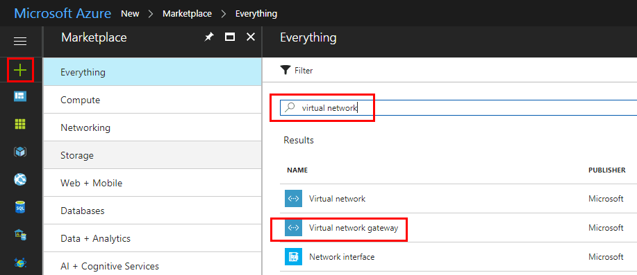 Now that we have our address space, subnet, and gateway subnet in place, let’s look at actually creating theย Azure Virtual Network Gateway. ย Hit the green + sign in the Azure portal. ย Search forย virtual network or similar and you should see the Virtual network gatewayย listed.