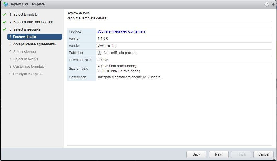 The OVA deploy process is pretty straightforward, so again I won’t include all the screens. ย On theย Review Details screen, we can see the disk requirements, etc.
