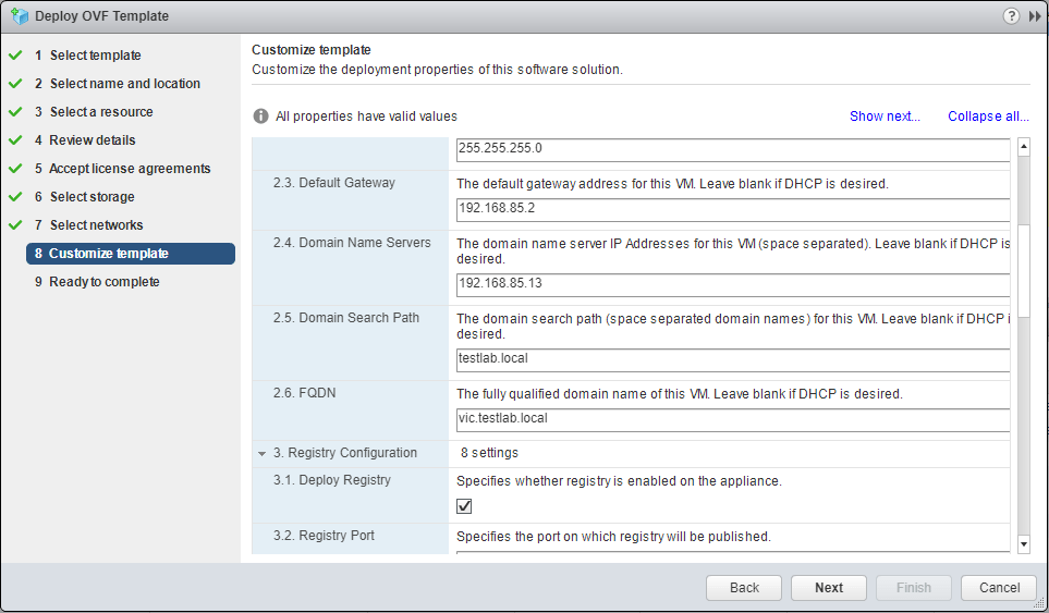 The customize template screen has a lot of user input fields here, including IP address settings, domain search, FQDN of the appliance, Docker registry settings, and many others.