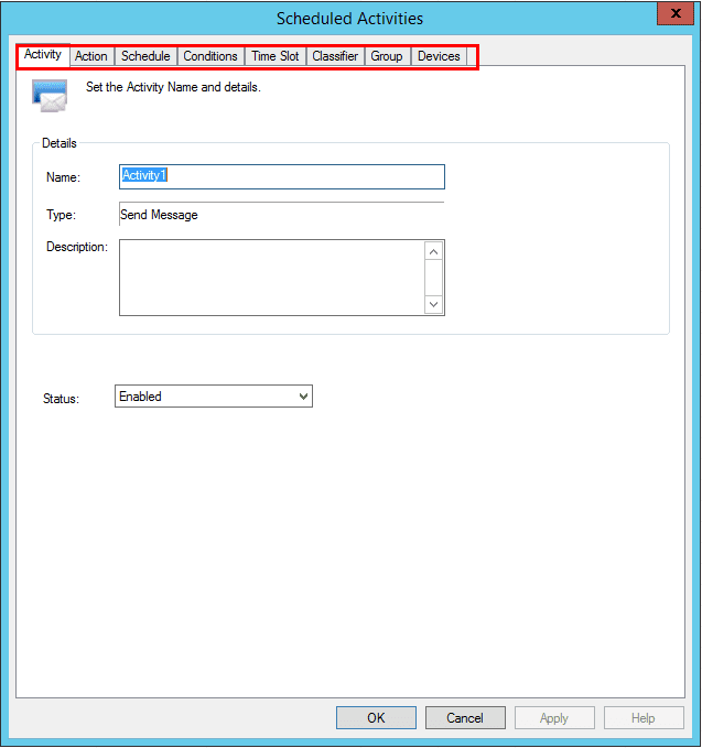 Either during the configuration of a scheduled activity or after we can set additional properties for the activity.ย As you can see below on the menu options for a scheduled activity we have already setup, we have numerous tabs for granular control over the activity.ย We can set certain conditions, classifiers, groups, or specify devices.