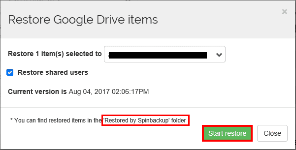 As noted in the restore dialog, the restored files are restored to the “Restored by Spinbackup” folder. Click the Start restore button once the file and version has been selected.