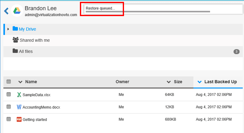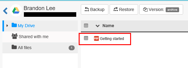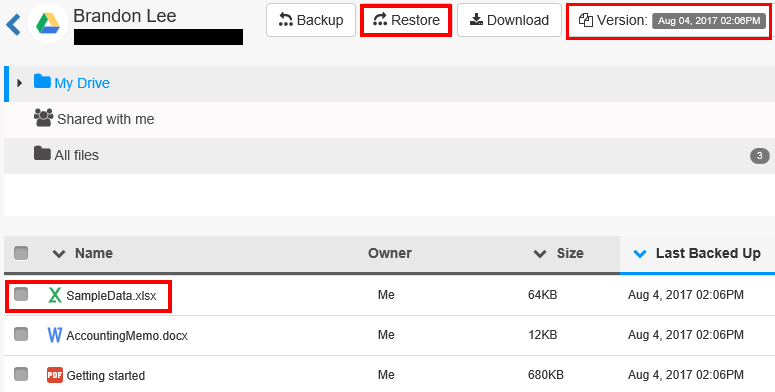 After uploading a few test files to the G Suite account and performing a few backups, let’s look at restoring our backups. This process is extremely easy. We navigate to the protected user the service we want to restore items to. Below, we have navigated to the Google Drive for the user. Notice we have the Restore button available. We simply select the file we want and click the Restore button. Also, we can select the Version button to display a listing of versions available to restore.