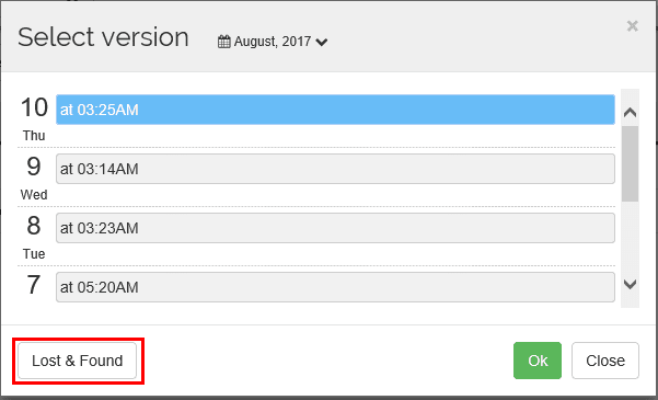 Under the versions button, we also have the Lost & Found option which displays any items that have been deleted between backups.