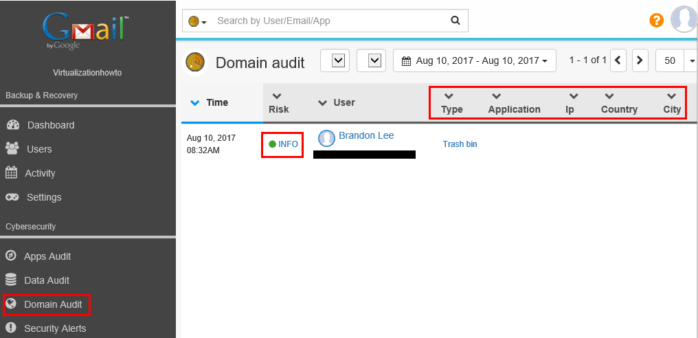 The Domain Audit area allows us to see an audit log of user activity as well as a risk assessment for those users accessing the system, their IP, country, city, etc. This allows for the needed visibility and assessment of users that are accessing the system and what they are doing.