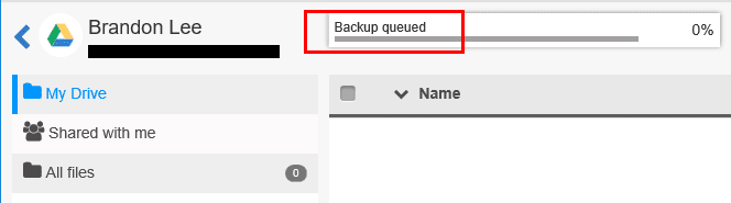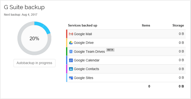 In the G Suite backup pane, you will see the current storage used and number of items contained therein. Additionally, you will see the autobackup process (that is configurable) kicking off. As you can see below, I have a new G Suite account so there is no data contained as of yet.