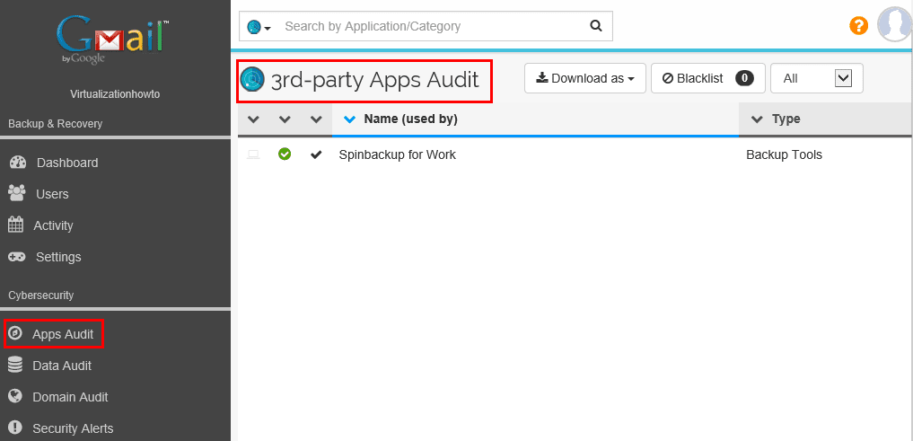 There are powerful Cybersecurity features built into Spinbackup including apps, data, and domain audits as well as security alerting. Below, in the Apps Audit area of the console, we see the 3rd-party Apps Audit listed which gives us a quick high level view of any 3rd-party apps and the potential security risk they pose.
