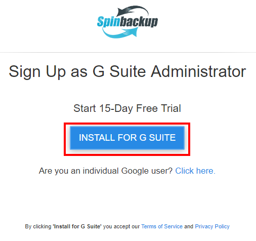 To sign up for Spinbackup you can either visit the link here:ย https://gapps.spinbackup.com/signup/ or you can search the G Suite marketplace for the app as it integrates with your G Suite console.