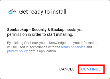 As with installing any app in G Suite, we will get a prompt for allowing Spinbackup permissions to the G Suite environment.