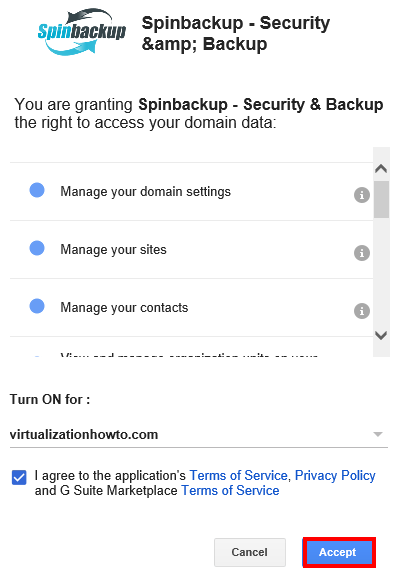 We see a listing of permissions that Spinbackup needs including Manage your domain settings, manage your sites, Manage your contacts, etc.