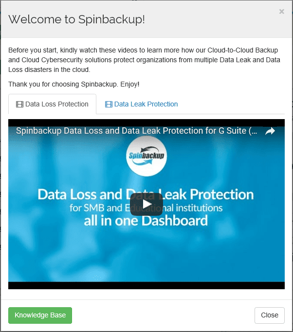 Initially we are prompted with an introductory message.ย The message contains a couple of videos that explain both the data loss protection and data leak protection aspects of Spinbackup – very much worth watching to get a good overview of the features and functionality.