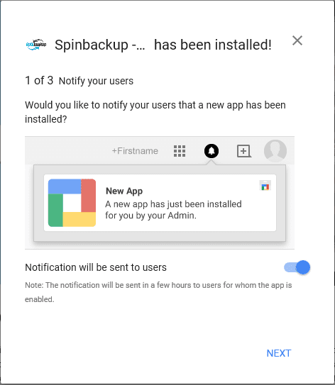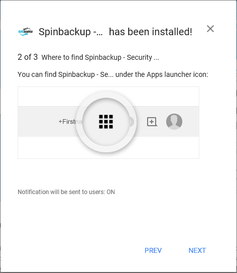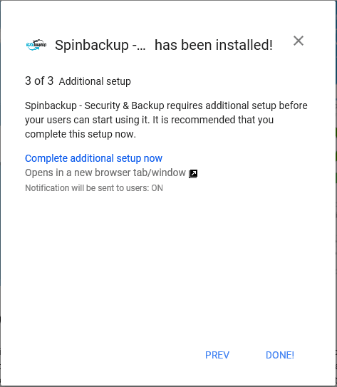 After the Spinbackup installation is finished, we are notified of the installation and the post installation wizard launches asking if we want to notify our users the app has been installed, where the app can be found and how to complete the initial configuration.
