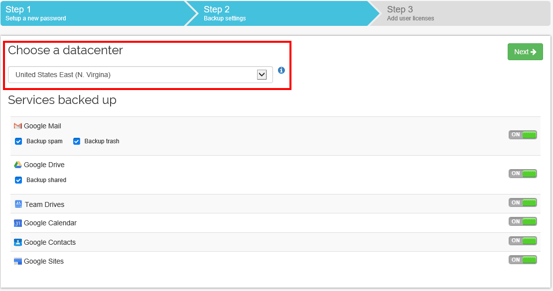 Next, Spinbackup allows us to have the flexibility to choose which AWS datacenter we want to utilize for storing our backups.ย I think it is great that Spinbackup allows us to choose which datacenter we want to house our data as โdata gravityโ is always at play when we think about data in the cloud.ย We want the datacenter to be as close to our geographic region as possible.ย Also, you see below we have the ability to flag on or off backups for individual components of our G Suite services.