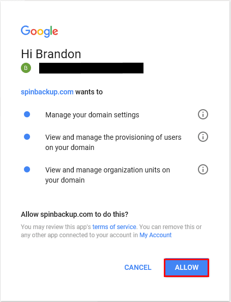 Next, we are prompted once again for permissions.ย We select to Allow for the Spinbackup app permissions.