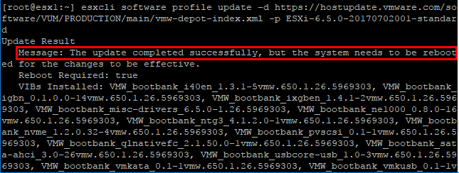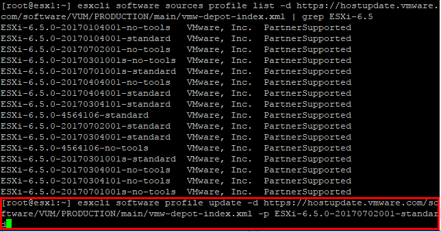 esxcli software profile update -d https://hostupdate.vmware.com/software/VUM/PRODUCTION/main/vmw-depot-index.xml -p ESXi-6.5.0-20170702001-standard