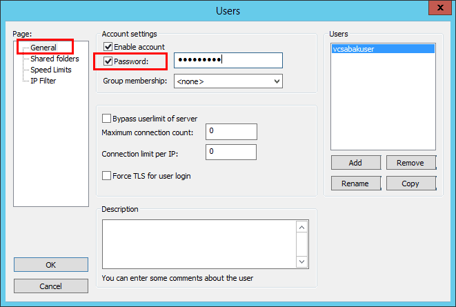 Select a name for the FileZilla user account to be added.ย We don’t have to worry too much about the groups since we are simply setting up a single user for our backup purposes.