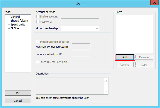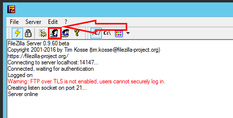 Let’s first take a look at how to setup FileZilla server username and password.ย Launch the FileZilla console and select the “users” button.