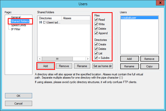 Next, click theย Shared folders page and clickย Add.ย Add the path the folder you want to be the target of the backup process.ย Then click the permissions checkboxes underย Files andย Directories to be able to read, write, delete, and append to both the files and folders.