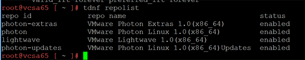 All of the packages with VCSA 6.5 are managed by VMware and updated with updates applied with VCSA 6.5 updates. ย Updating these or manipulating them manually isn’t supported. ย However, you can take a look at the installed packages which also is interesting to see the underlying packages installed with VCSA 6.5. ย Photon in the minimal installation doesn’t have a full package manager like yum installed. ย Instead it manages packages with an open source, yum-compatible package manager called tdnf, for Tiny DNF. ย Tdnf keeps the operating system as small as possible while preserving yum’s robust package-management capabilities. On Photon OS, tdnf is the default package manager for installing new packages. It is a C implementation of DNF package manager.