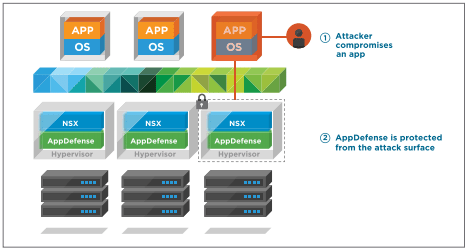 AppDefense has built in defenses to protect itself as well. It is part of the VMware hypervisor and has a special, isolated, protected process that runs to continually monitor virtual machines. This drastically reduces the likelihood of AppDefense being compromised.