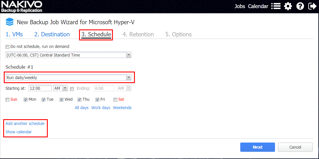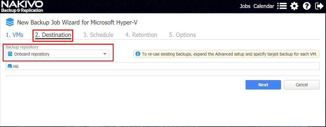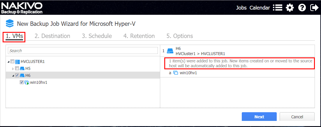 Creating a backup job is super easy in the intuitive Nakivo interface. I like the wizard driven workflow that allows you to easily add VMs and configure options. Note on the New Backup Job Wizard for Microsoft Hyper-V you can place a checkbox by the host itself to have any new VMs automatically added to the backup job which is a really easy way to make sure any new Hyper-V virtual machines are automatically backed up.