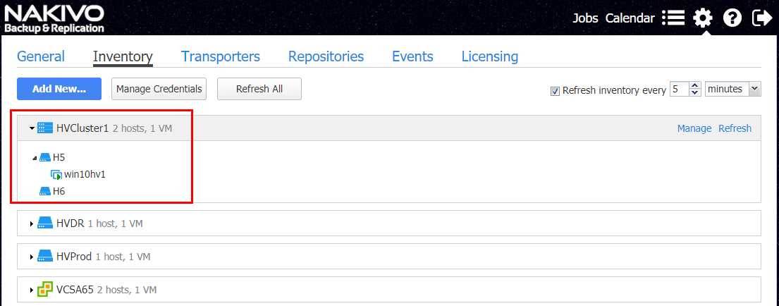 The first thing we need to do is add the Hyper-V Cluster to our inventory in Nakivo Backup & Replication. To do that we navigate to the Settings “cog” and Inventory tab. We will select the Add New button.
