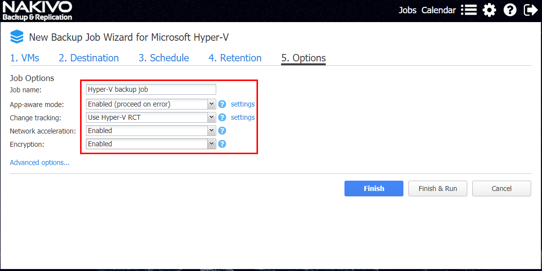 Finally, on the options screen, we have a number of options we can select here. If we are backing up an application server such as a database server, we want to make sure we have App-aware mode set to enabled. This makes sure the backups are transactionally consistent. Also, with Windows Server 2016 we can use Hyper-V RCT, which is Microsoft’s implementation of “changed block tracking.” For security and performance we can also enable encryption and network acceleration on the job.