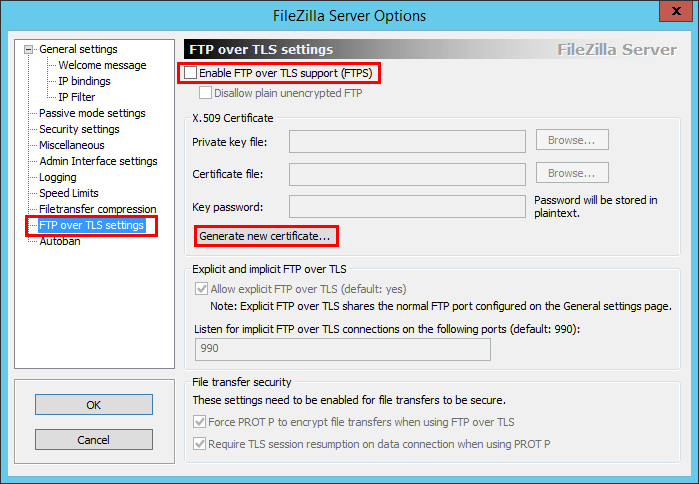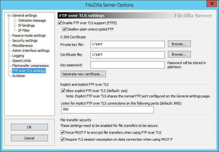 We have several areas of interest on theย FTP over TLS settings configuration screen.ย Notice theย Enable FTP over TLS support (FTPS)ย checkbox as well as theย Generate new certificate… button.