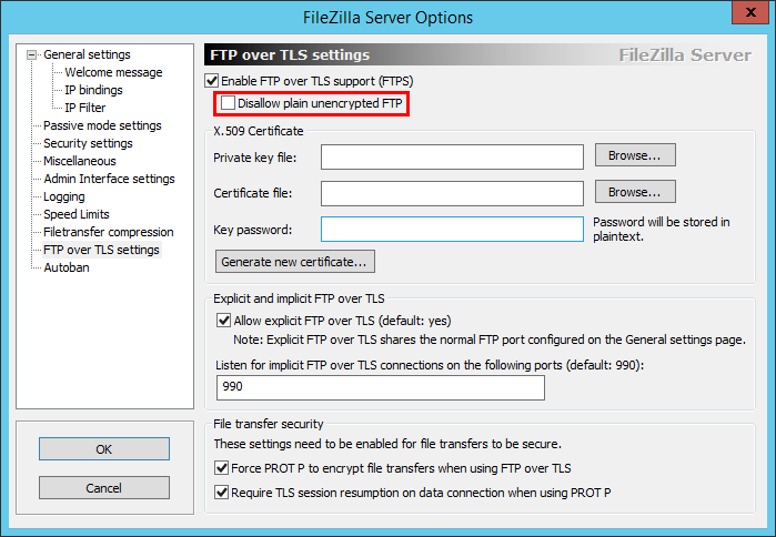 Our screen should look like the following with the certificate in place and we are disallowing plain unencrypted FTP communication.