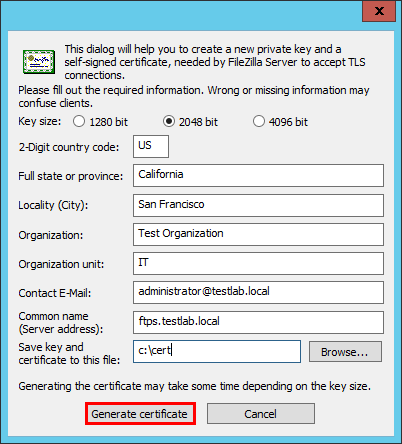 When we click theย Generate new certificate button, we are prompted with the familiar certificate information to be filled out.ย When we click theย Generate certificate button, the certificate is generated for the FTPS connection.